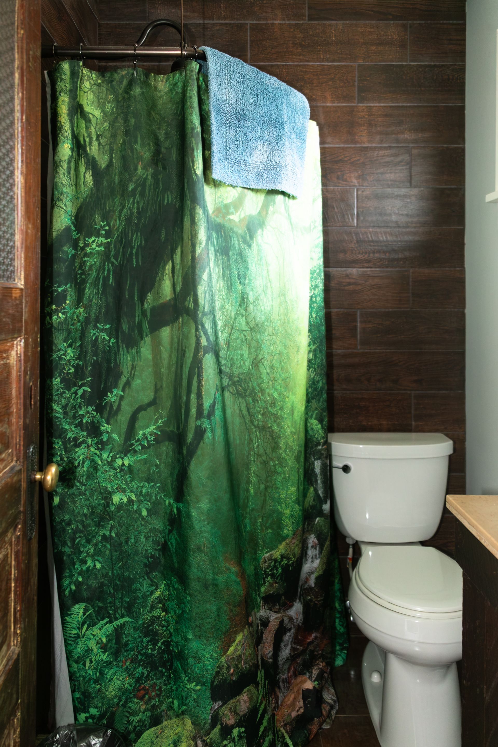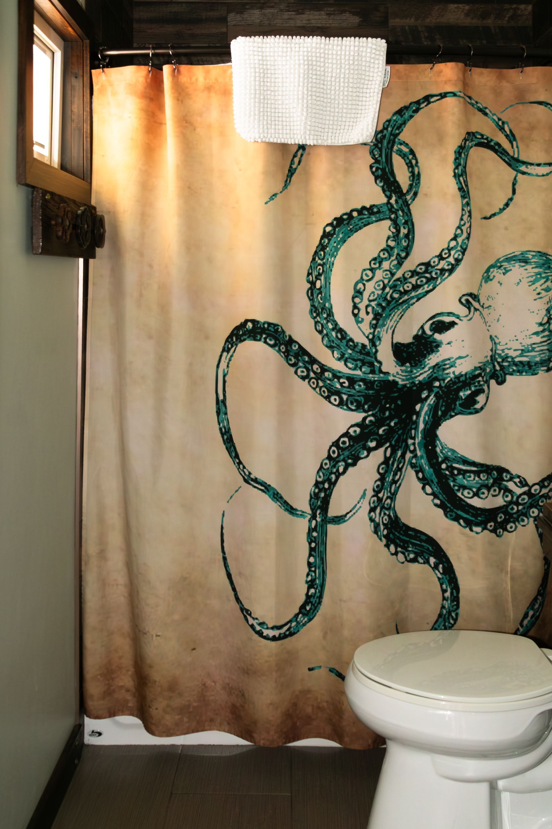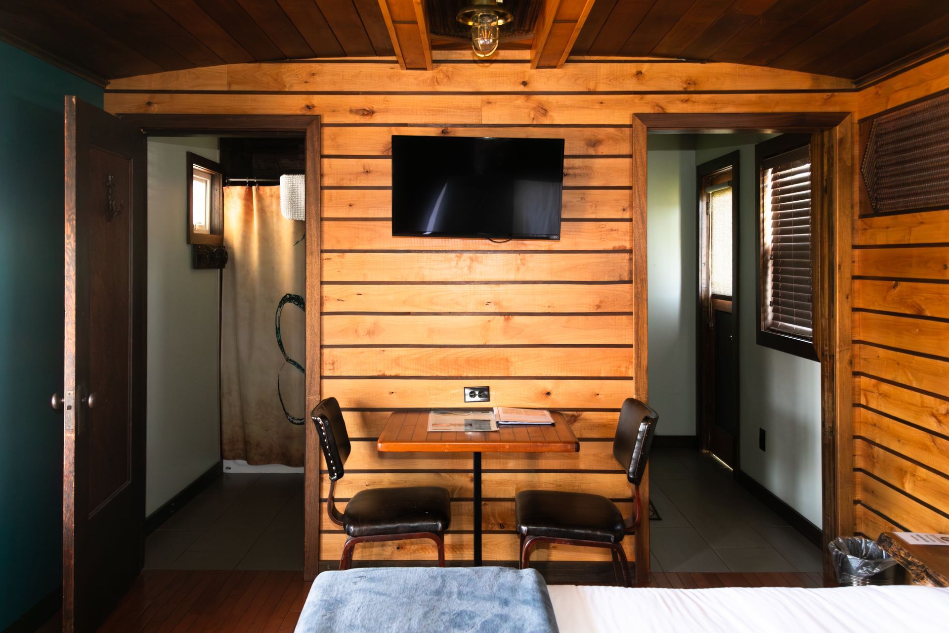 A standout room with a curved ceiling, redwood burl headboard, and a small galley kitchen. This room is