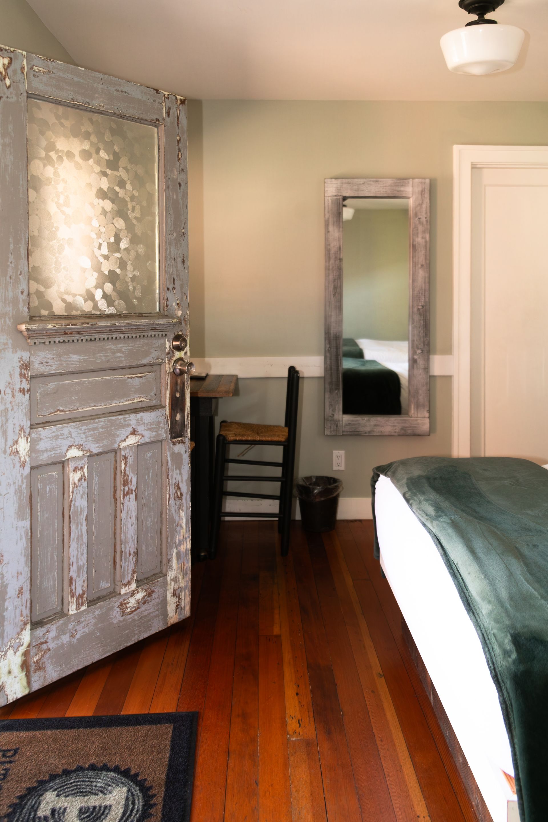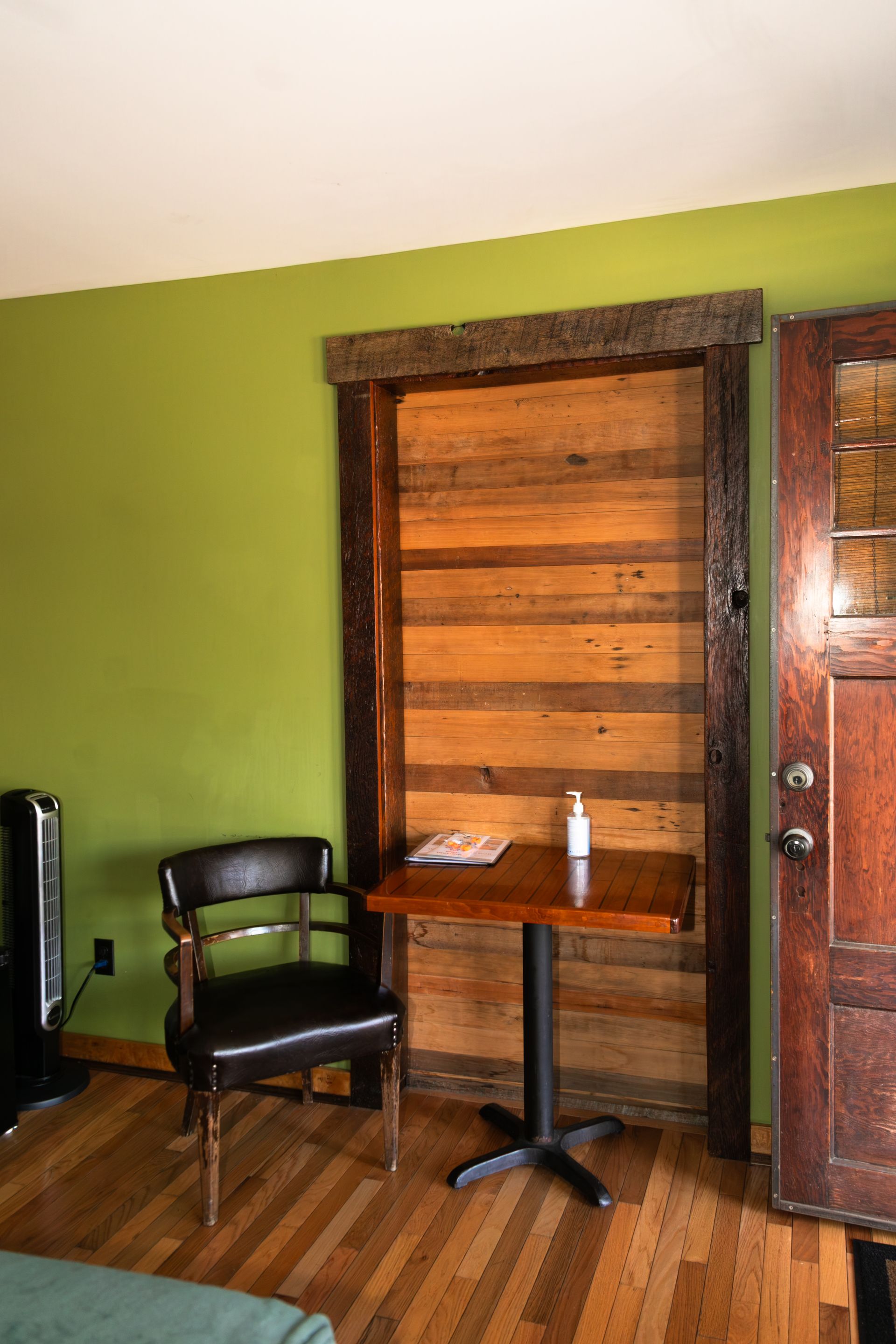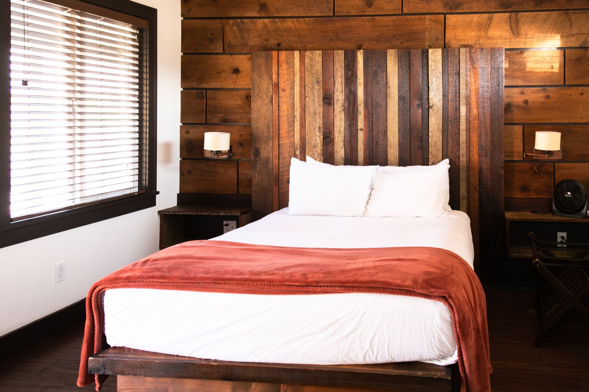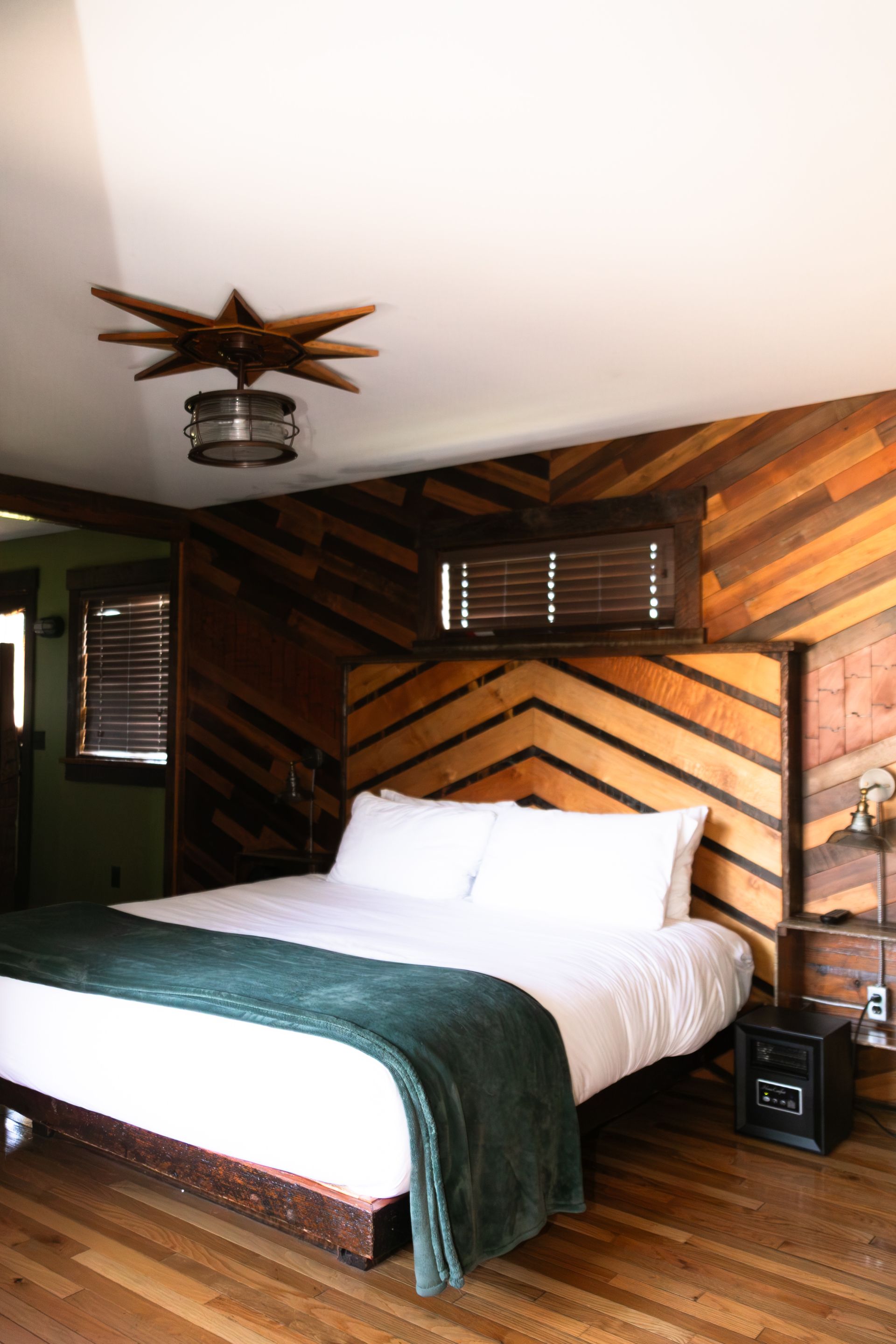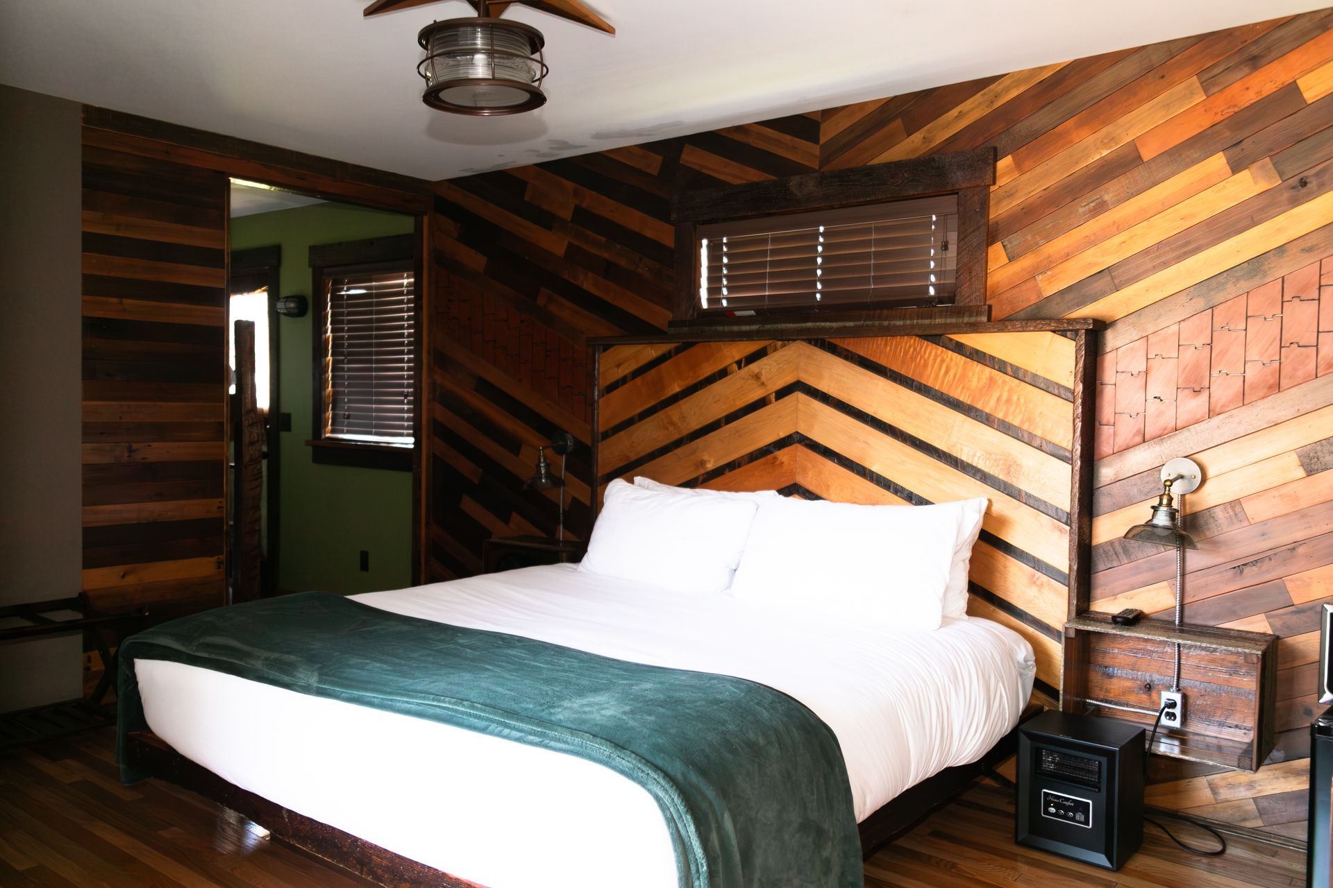 Designed with reclaimed materials, this suite features a king-sized bed, a reading nook, and a full set of
